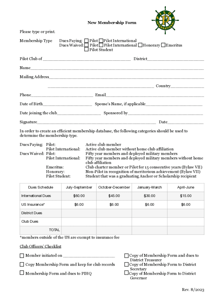 Este formulario es utilizado para inscribirse en Pilot International y sus clubes asociados, especificando el tipo de membresía y la información personal del solicitante.