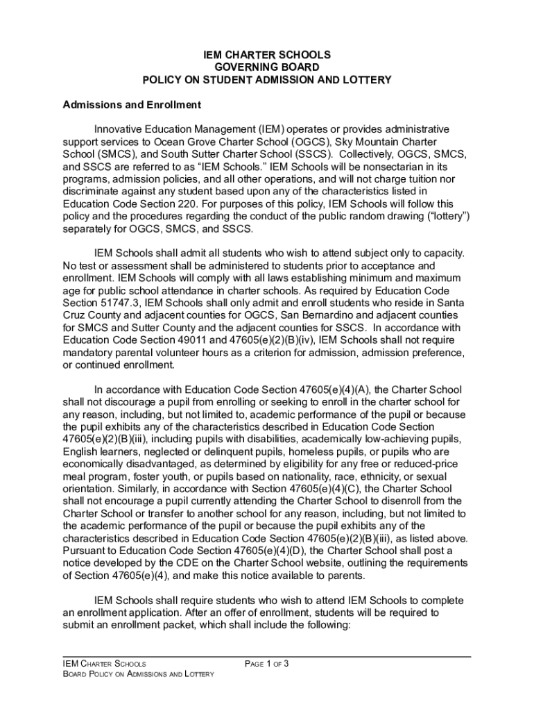 Get the free Iem Charter Schools Governing Board Policy on Student Admission and Lottery