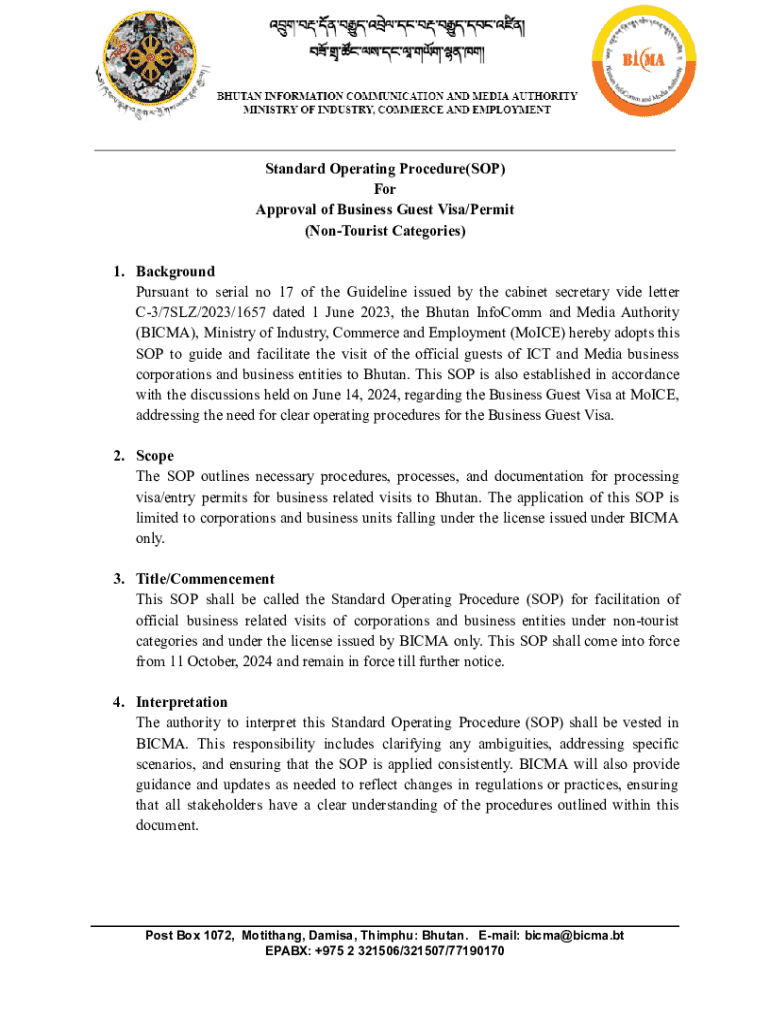Este procedimiento estándar tiene como objetivo guiar y facilitar la visita de los invitados oficiales de las corporaciones comerciales de TIC y medios a Bután, estableciendo procedimientos claros