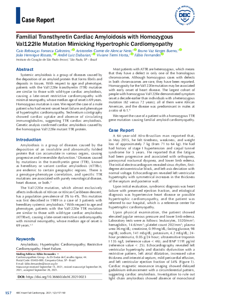 Case Report Familial Transthyretin Cardiac Amyloidosis with Homozygous Val122Ile Mutation Mimicking Hypertrophic Cardiomyopathy Caio Rebouas Fonseca Cafezeiro,1 Aristoteles Comte de Alencar Neto,1