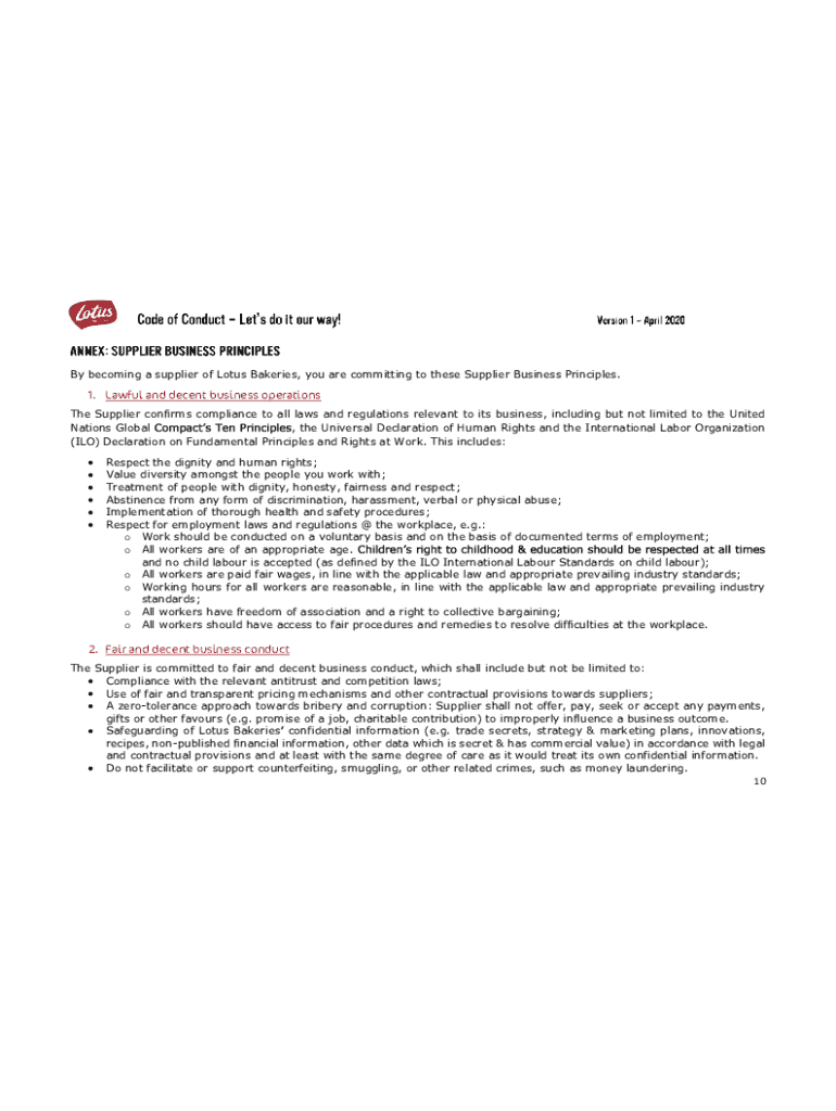 By becoming a supplier of Lotus Bakeries, you are committing to these Supplier Business Principles.1. Lawful and decent business operations The Supplier confirms compliance to all laws and regulations
