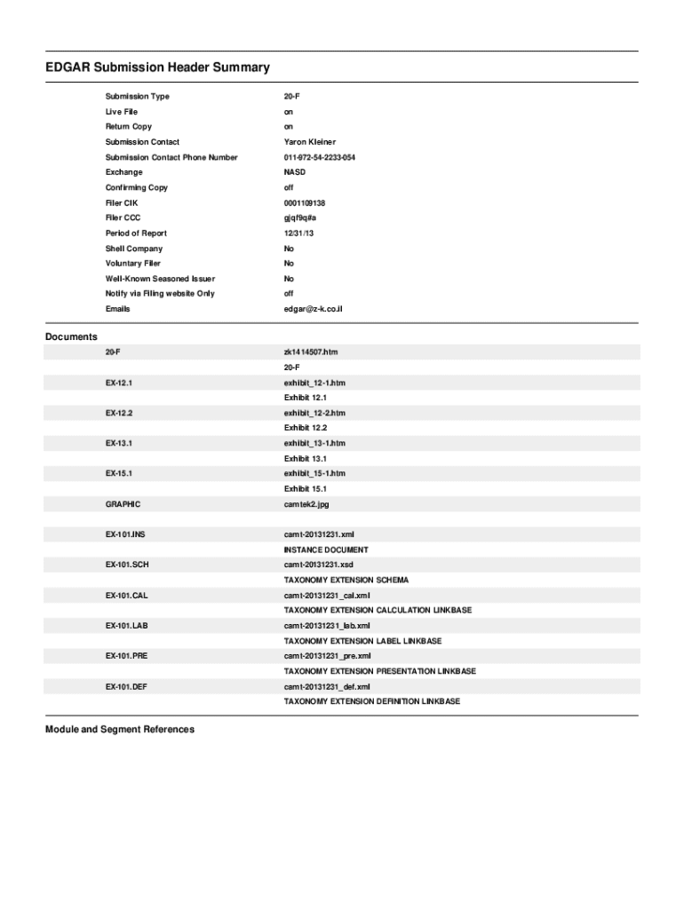 This document is the annual report of Camtek Ltd. for the fiscal year ended December 31, 2013, filed with the SEC. It includes financial statements, management discussion, and analysis, as well as