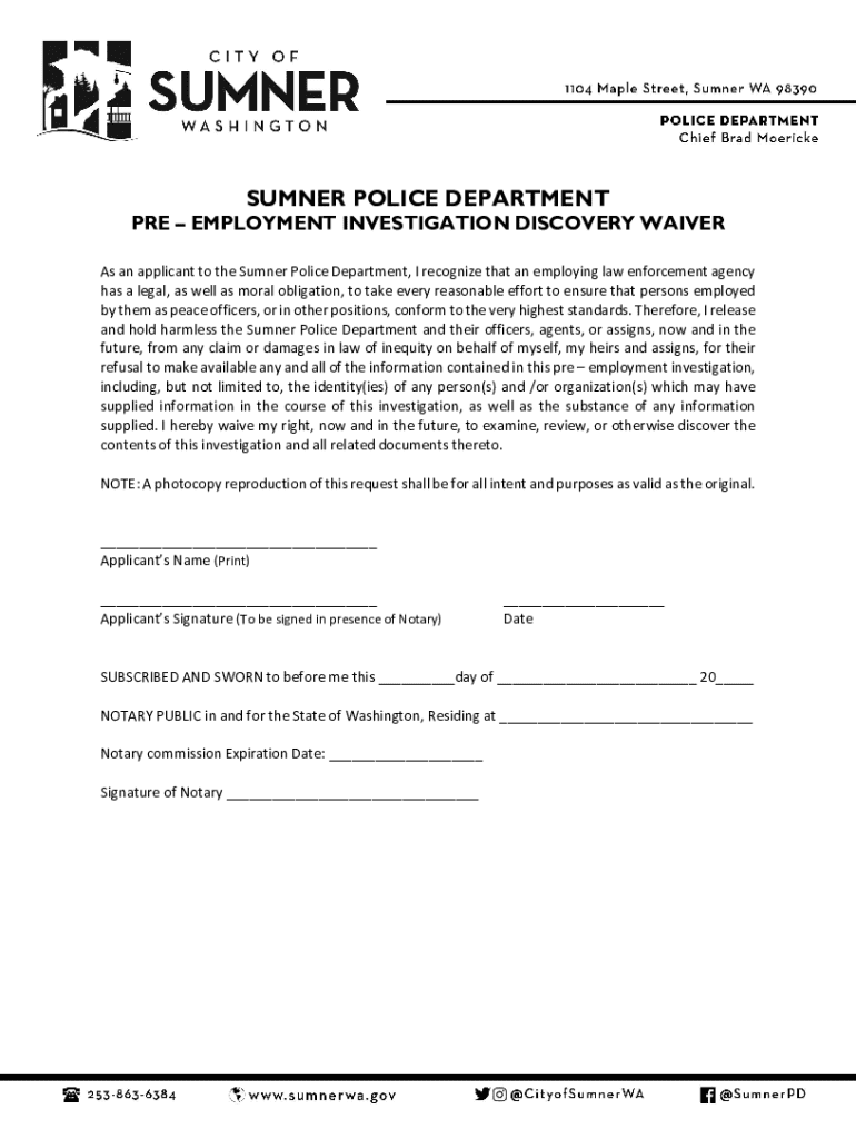 This document serves as a waiver for applicants to the Sumner Police Department, allowing the department to conduct thorough pre-employment investigations and absolving them from liability regarding