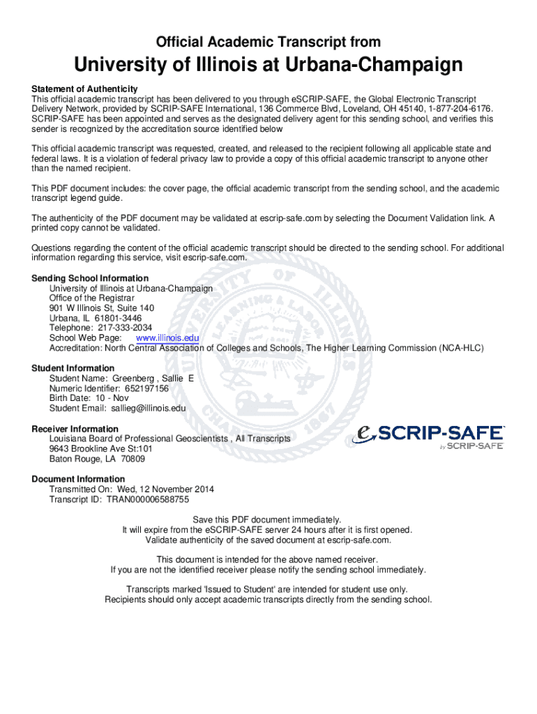 Official Academic Transcript fromUniversity of Illinois at UrbanaChampaign Statement of Authenticity This official academic transcript has been delivered to you through eSCRIPSAFE, the Global Electronic