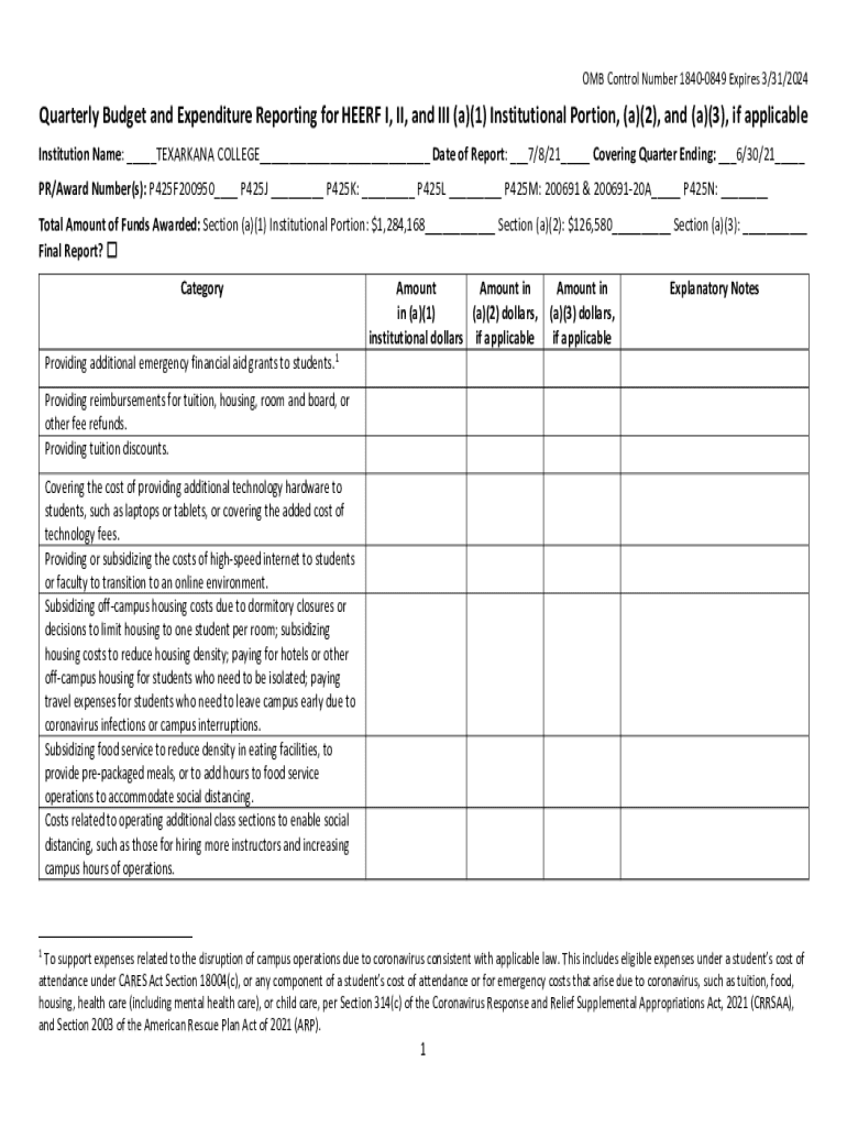 OMB Control Number 18400849 Expires 3/31/2024Quarterly Budget and Expenditure Reporting for HEERF I, II, and III (a)(1) Institutional Portion, (a)(2), and (a)(3), if applicable Institution Name: ___TEXARKANA