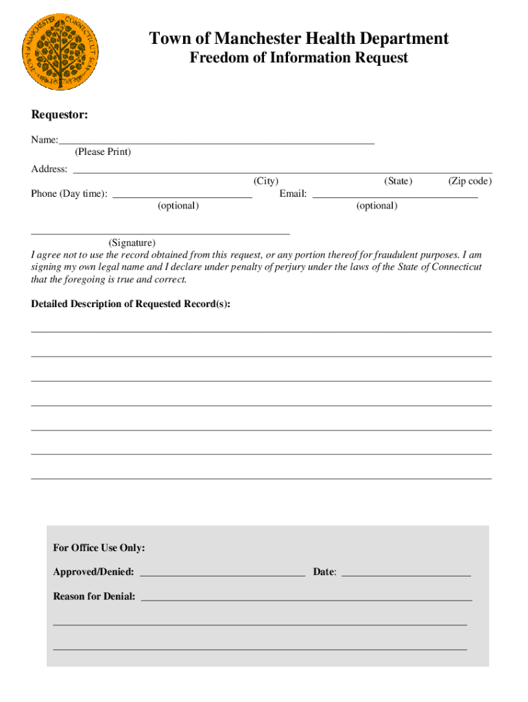 This document is a request form for obtaining records under the Freedom of Information Act from the Town of Manchester Health Department. It requires details about the requestor and a description