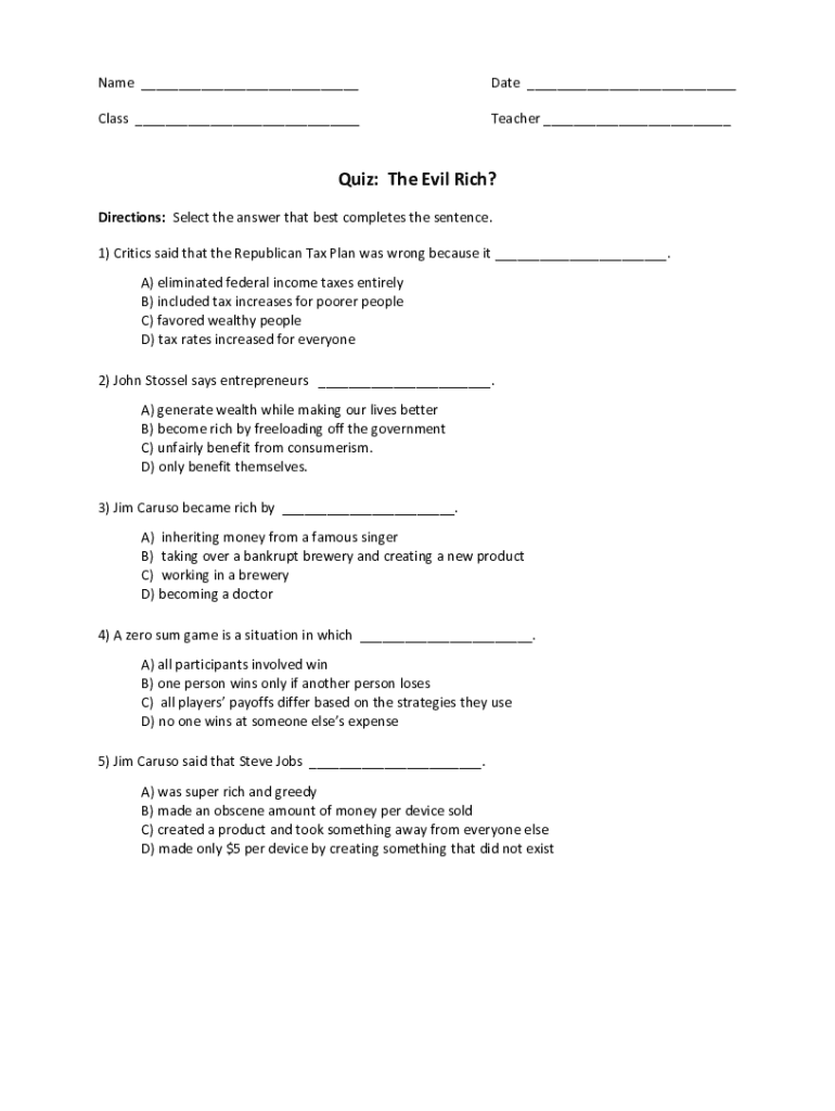 Name ___Date ___Class ___Teacher ___Quiz: The Evil Rich? Directions: Select the answer that best completes the sentence. 1) Critics said that the Republican Tax Plan was wrong because it ___. A) eliminated