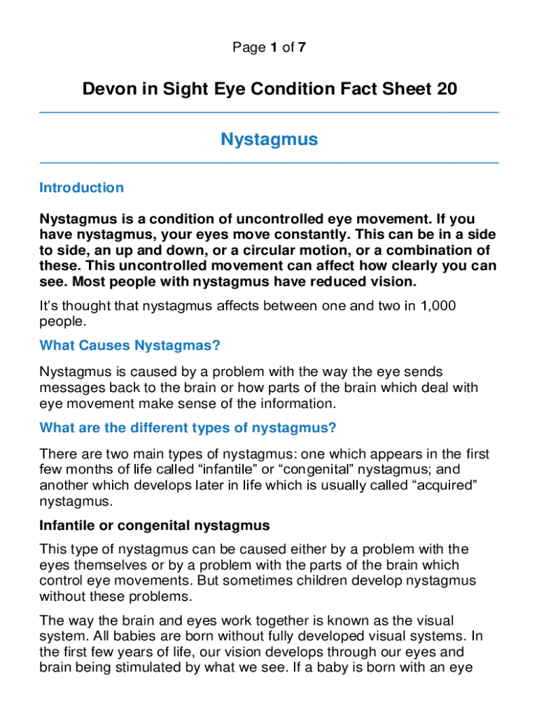 Nystagmus is a condition of uncontrolled eye movement, affecting vision clarity and often leading to reduced vision. This fact sheet provides information on causes, types, effects on sight, management