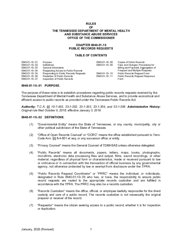 Este documento establece los procedimientos para las solicitudes de acceso a registros públicos recibidas por el Departamento de Salud Mental y Servicios de Abuso de Sustancias de Tennessee, proporcionando
