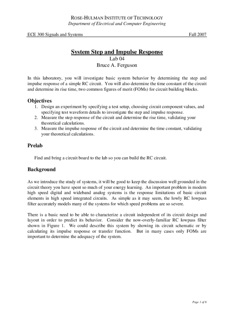 This laboratory exercise involves investigating the step and impulse response of a simple RC circuit, determining the time constant and rise time as key figures of merit for circuit analysis and design.