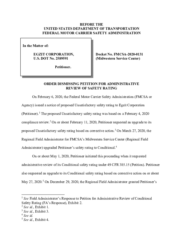 Get the free Order Dismissing Petition for Administrative Review of Safety Rating