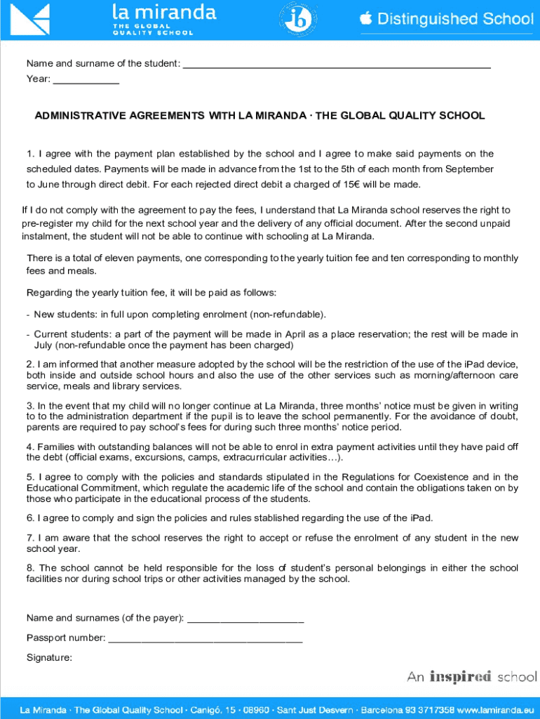 Name and surname of the student: Year:ADMINISTRATIVE AGREEMENTS WITH LA MIRANDA THE GLOBAL QUALITY SCHOOL 1. I agree with the payment plan established by the school and I agree to make said payments