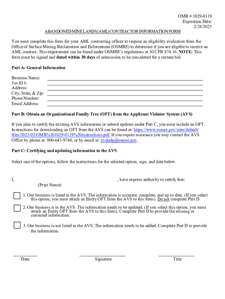 This form is required for AML contractors to request an eligibility evaluation from the Office of Surface Mining Reclamation and Enforcement (OSMRE) to determine eligibility for receiving an AML contract.