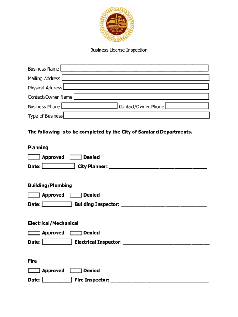 This form is used for the inspection and approval of business licenses by various departments in the City of Saraland, including planning, building/plumbing, electrical/mechanical, and fire.