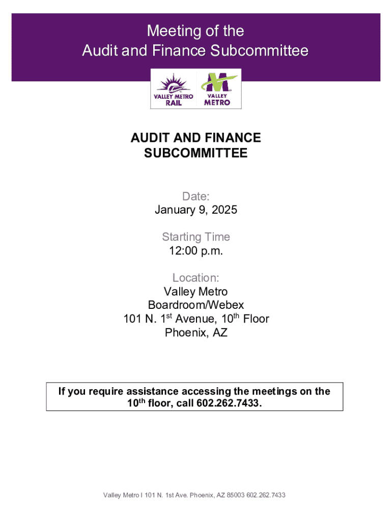 Meeting of the Audit and Finance SubcommitteeAUDIT AND FINANCE SUBCOMMITTEE Date: January 9, 2025 Starting Time 12:00 p.m. Location: Valley Metro Boardroom/Webex 101 N. 1st Avenue, 10th Floor Phoenix,