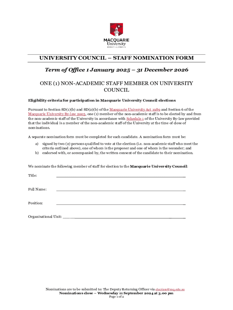 Este formulario se utiliza para nominar a un miembro del personal no académico para ser elegido en el Consejo de la Universidad Macquarie. Incluye criterios de elegibilidad, instrucciones para la