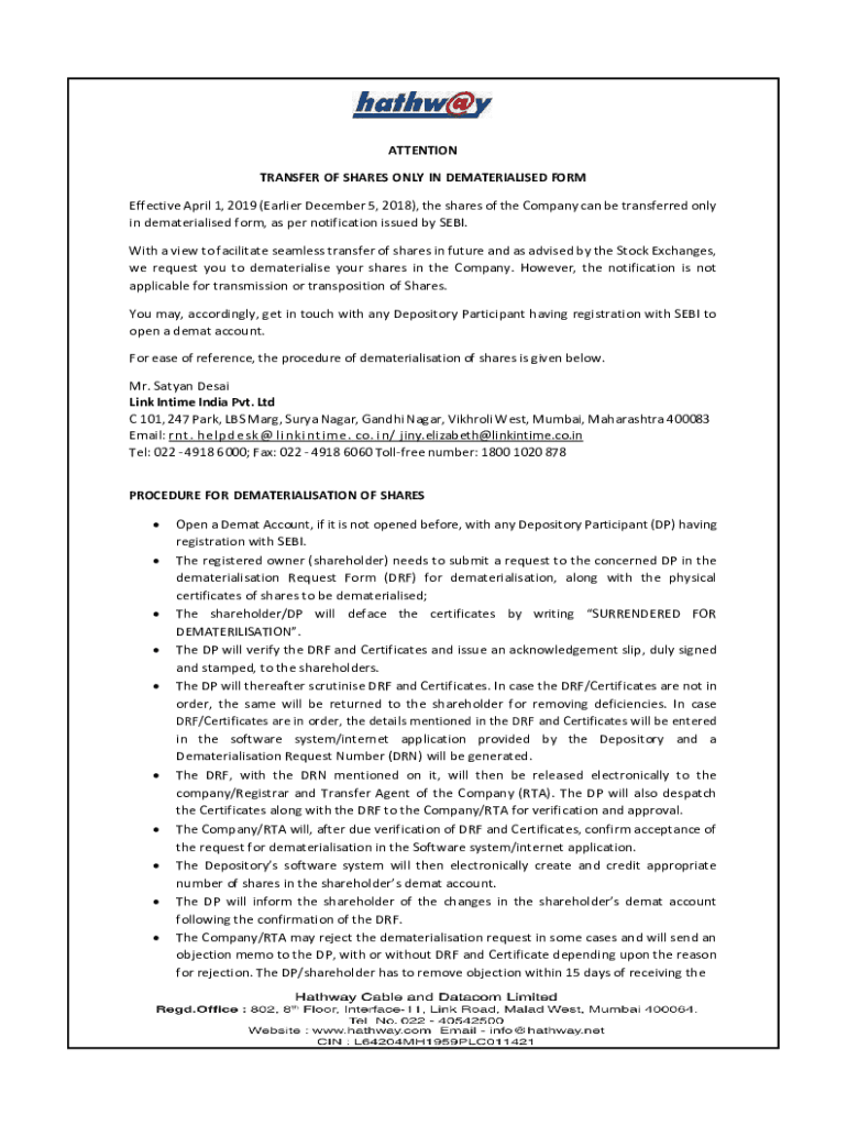Get the free TRANSFER OF SHARES ONLY IN DEMATERIALISED FORM