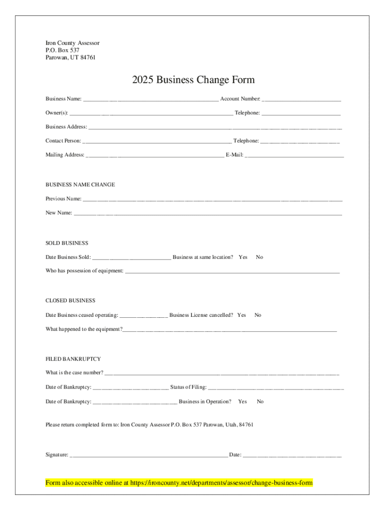 This form is used to notify the Iron County Assessor of changes related to a business, including name changes, business sales, closures, and bankruptcy filings.