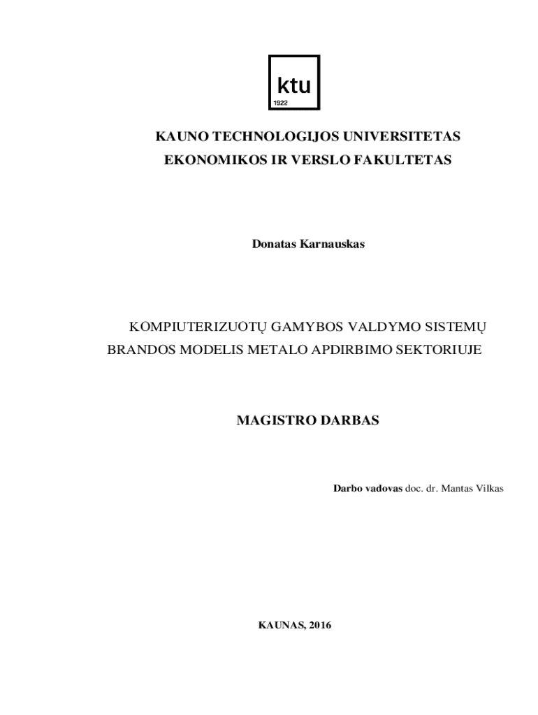 Šiame darbe nagrinėjama kompiuterizuotų gamybos valdymo sistemų brandos modelio kūrimas metalo apdirbimo sektoriuje. Tyrimo tikslas yra analizuoti ir įvertinti gamybos valdymo procesus bei sukurti