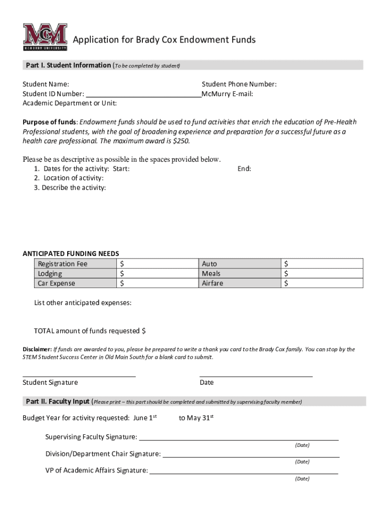 Get the free Application for Brady Cox Endowment Funds