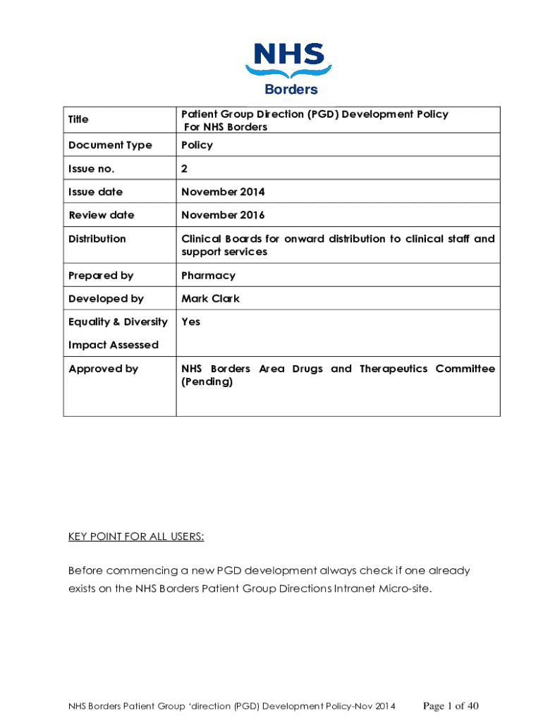 This policy provides guidelines and practical information for healthcare professionals regarding the development, review, authorisation, and usage of Patient Group Directions (PGDs) within NHS Borders.