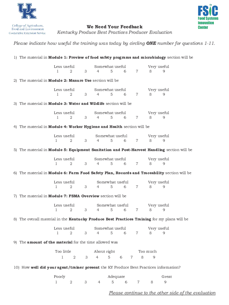 Este formulario está diseñado para evaluar la utilidad de la capacitación en las Mejores Prácticas de Producción de Kentucky. Se requiere que los participantes califiquen varios módulos sobre