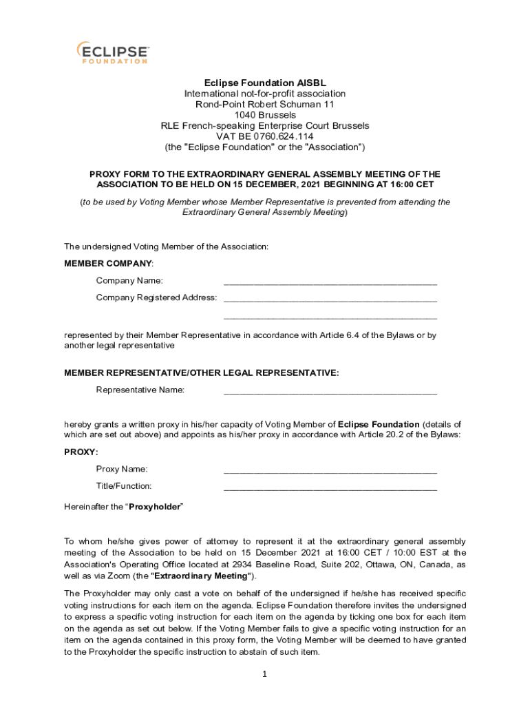 This proxy form is to be used by Voting Members of the Eclipse Foundation who are unable to attend the Extraordinary General Assembly Meeting on 15 December 2021. It allows members to appoint a proxy