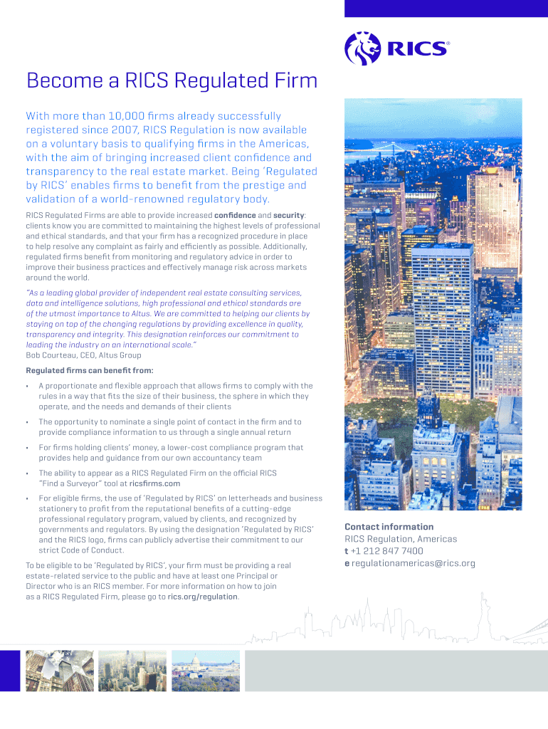 Becoming RICS regulated means becoming a member of the Royal Institution of Chartered Surveyors, which is a professional body promoting and enforcing the highest international standards in the valuation, management, and development of land, real estate, construction, and infrastructure.