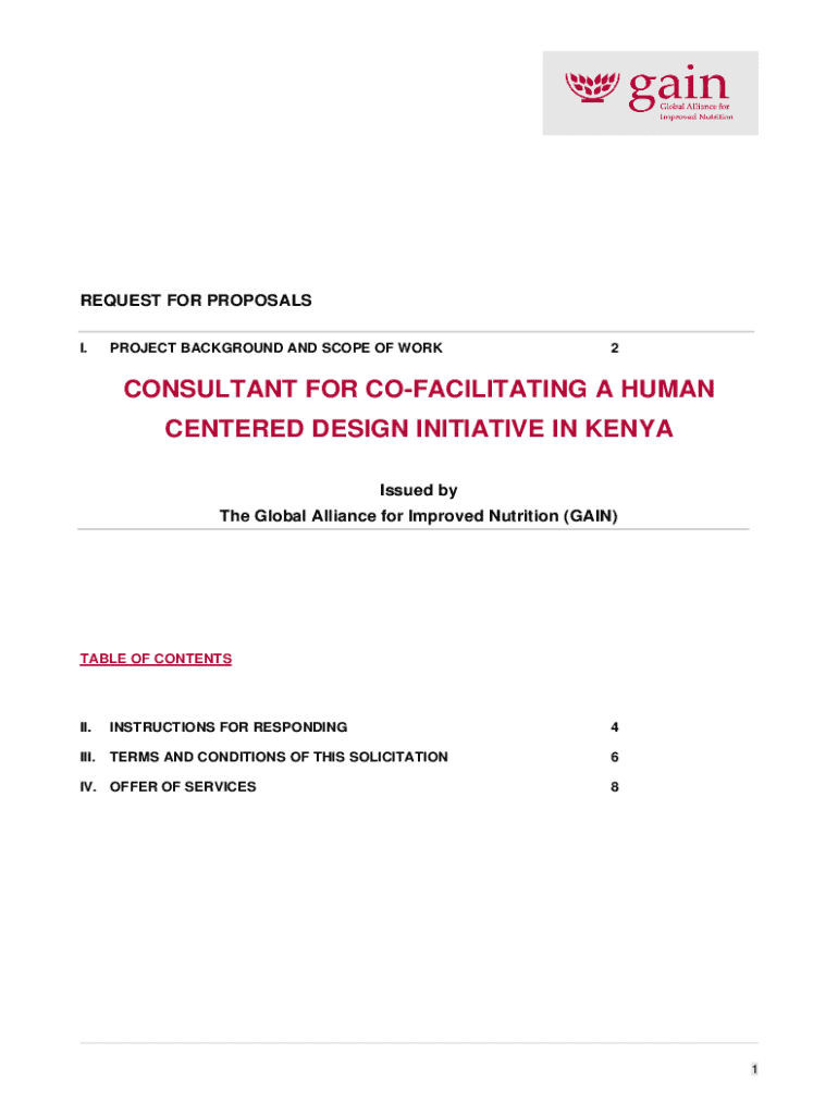 REQUEST FOR PROPOSALS I.PROJECT BACKGROUND AND SCOPE OF WORK2CONSULTANT FOR COFACILITATING A HUMAN CENTERED DESIGN INITIATIVE IN KENYA Issued by The Global Alliance for Improved Nutrition (GAIN)TABLE