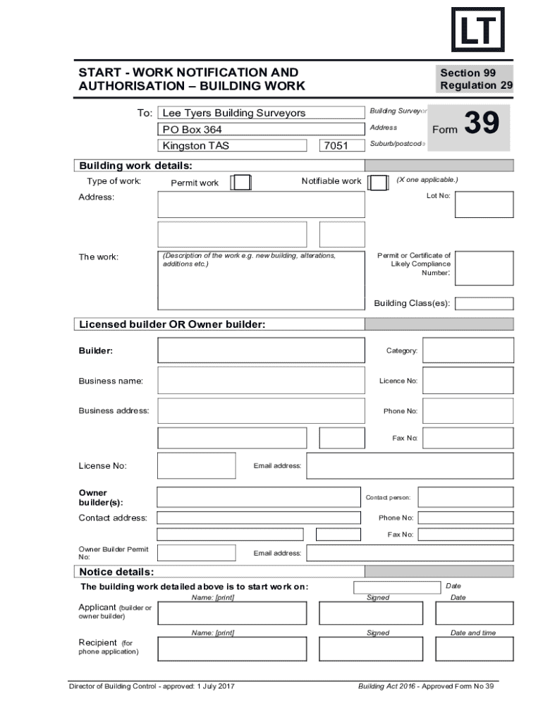 START WORK NOTIFICATION AND AUTHORISATION BUILDING WORKSection 99 Regulation 29To: Lee Tyers Building SurveyorsBuilding SurveyorPO Box 364FormAddressKingston TAS7051Suburb/postcode39Building work