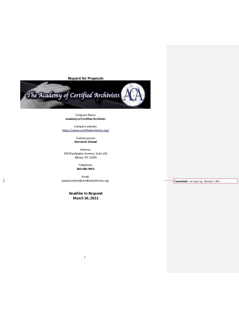 This document outlines the request for proposals (RFP) from the Academy of Certified Archivists for conducting a job analysis relevant to the archival profession. It includes details on the purpose