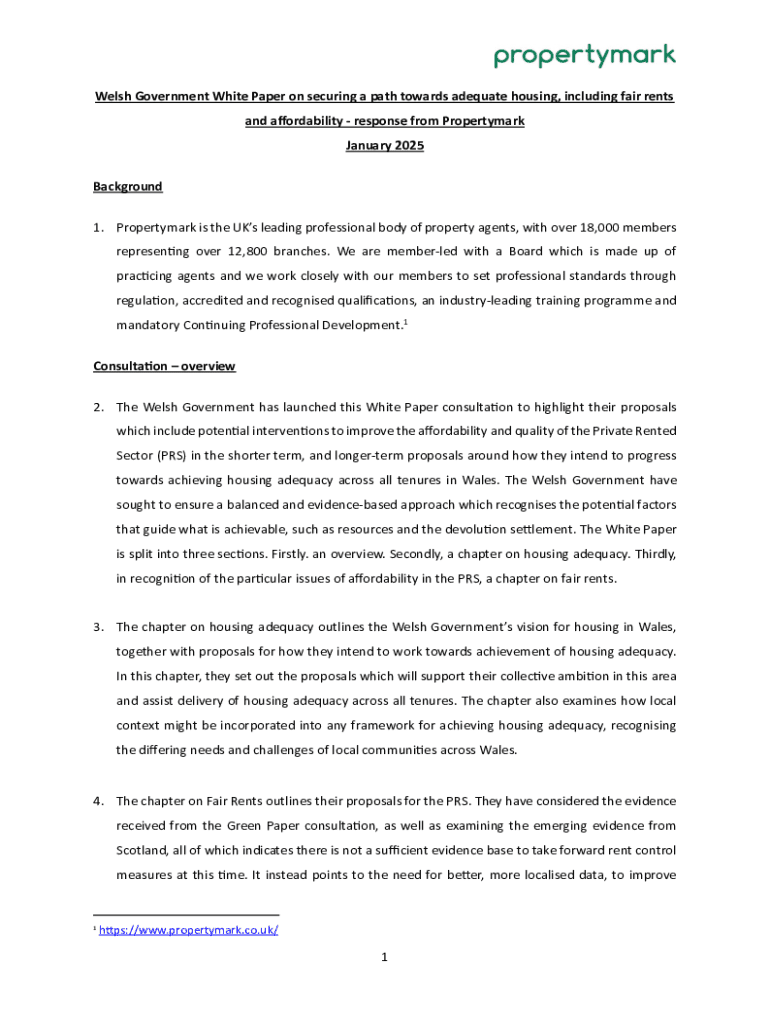 This document outlines Propertymark\'s response to the Welsh Government\'s White Paper regarding housing adequacy, including proposals for fair rents and affordability in the Private Rented Sector