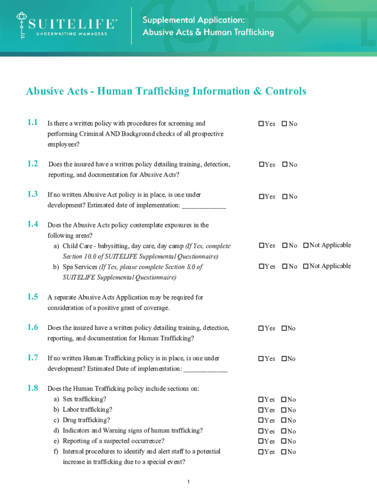 Abusive Acts Human Trafficking Information & Controls 1.1Is there a written policy with procedures for screening and performing Criminal AND Background checks of all prospective employees?YesNo1.2Does