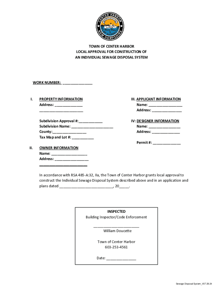 This document serves as local approval from the Town of Center Harbor for the construction of an Individual Sewage Disposal System, detailing requirements for property, applicant, designer, and owner