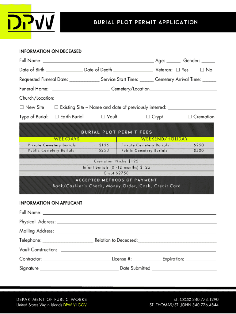 This document serves as an application for a burial plot permit, providing essential information about the deceased, applicant, burial type, and payment details.