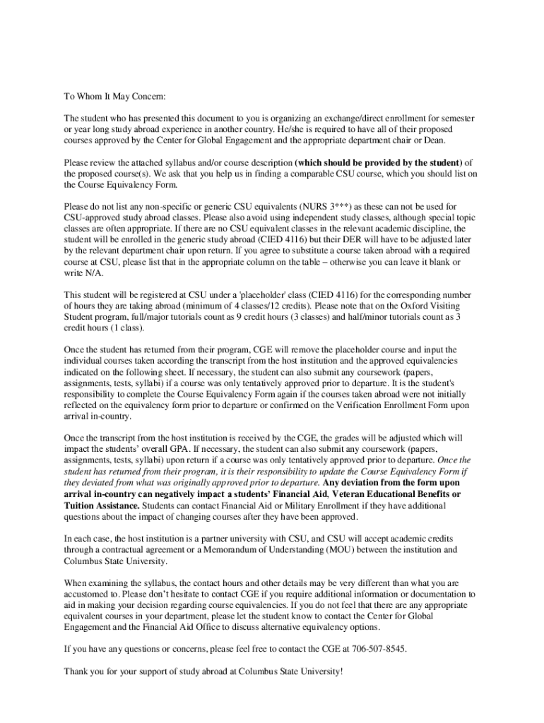 This document is used by students planning to study abroad to seek approval for course equivalencies from their home institution, Columbus State University (CSU). It outlines the necessary processes