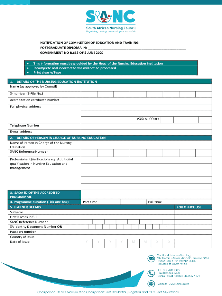 This document serves as a notification for the completion of education and training for individuals who have completed a postgraduate diploma in nursing. It requires detailed information from the