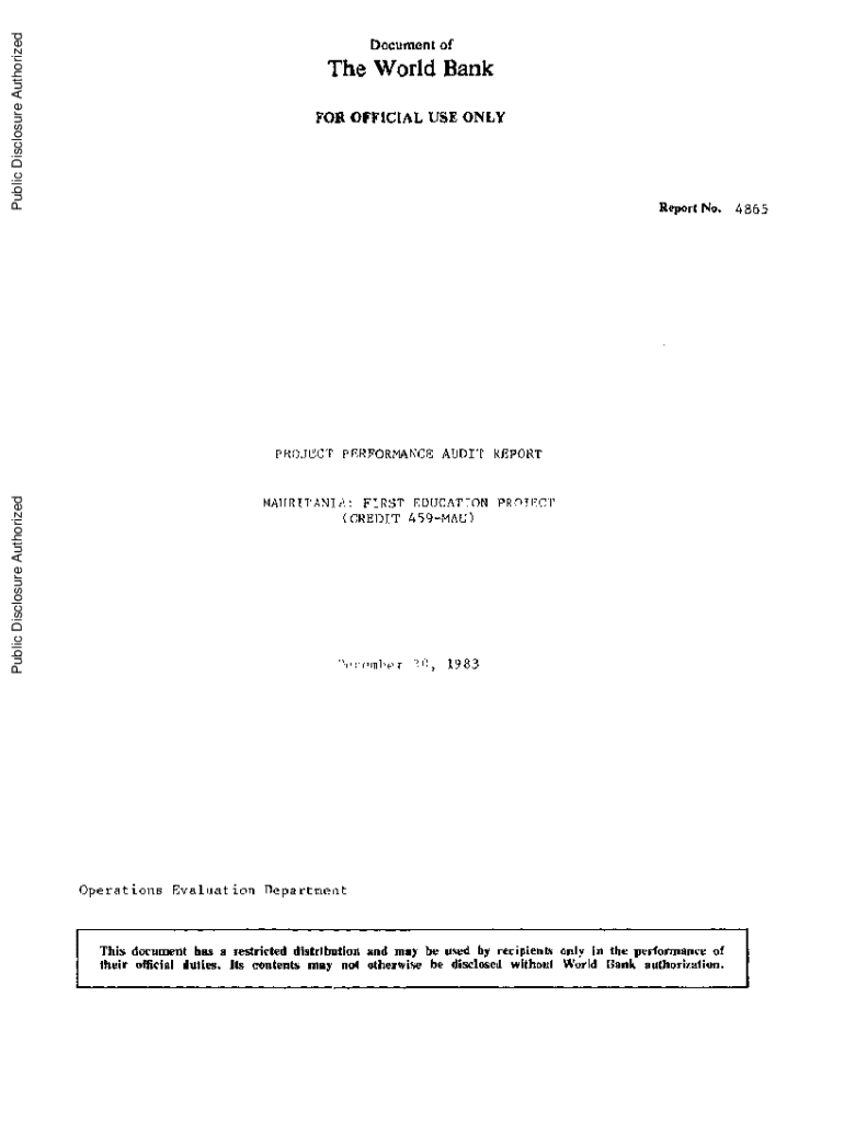 This document details the performance audit regarding the First Education Project in Mauritania, evaluating its objectives, implementation, and outcomes from beginning to completion, focusing on the