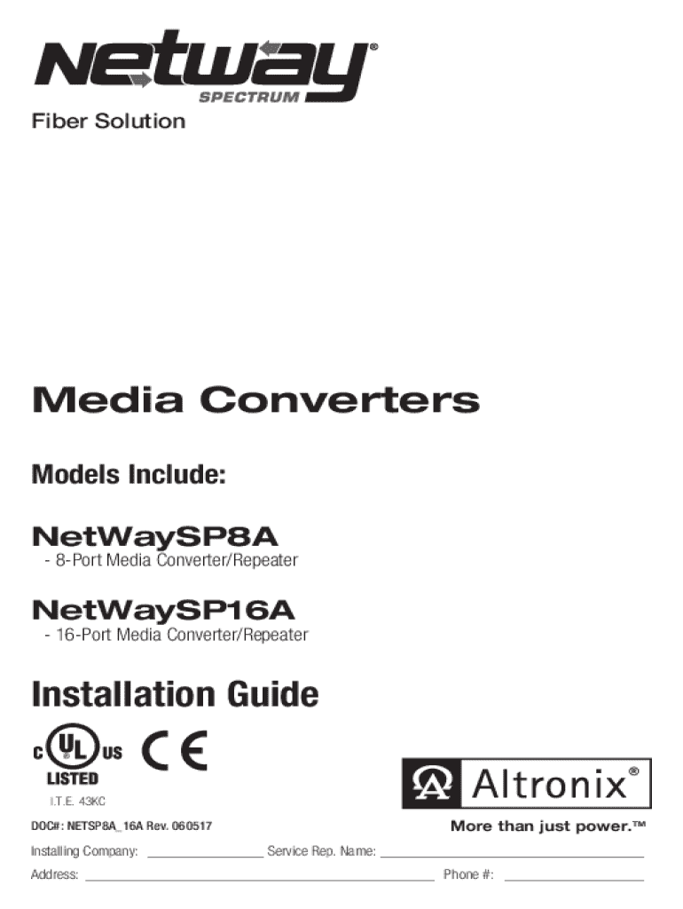 Fiber SolutionMedia Converters Models Include: NetWaySP8A 8Port Media Converter/RepeaterNetWaySP16A 16Port Media Converter/RepeaterInstallation Guide I.T.E. 43KC DOC#: NETSP8A_16A Rev. 060517More