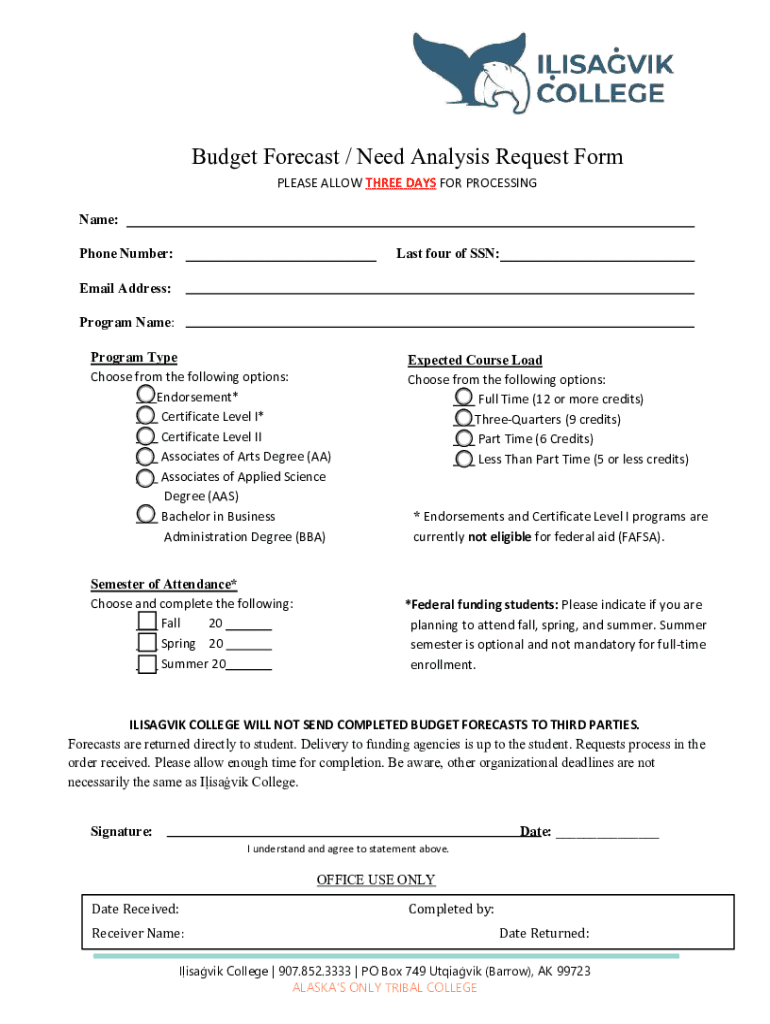This form is used to request a budget forecast for students attending Iḷisaġvik College. It collects personal information along with details about the program and semester of attendance. Processing