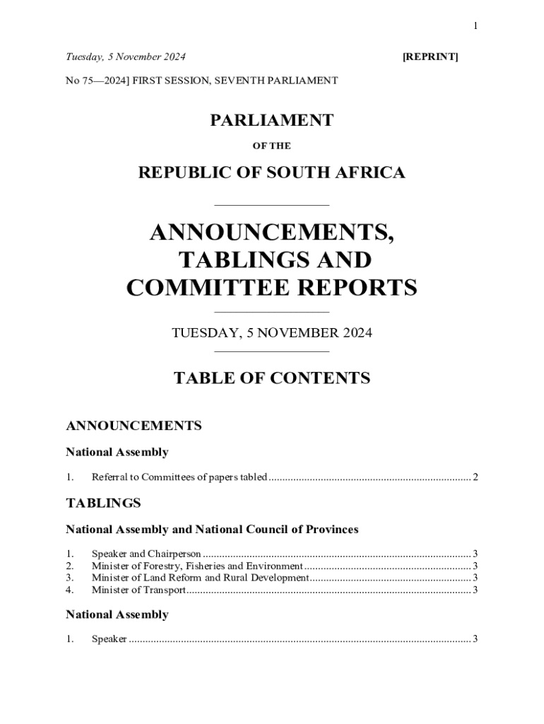 1 [REPRINT]Tuesday, 5 November 2024 No 752024] FIRST SESSION, SEVENTH PARLIAMENTPARLIAMENT OF THEREPUBLIC OF SOUTH AFRICA ___ANNOUNCEMENTS, TABLINGS AND COMMITTEE REPORTS ___TUESDAY, 5 NOVEMBER 2024