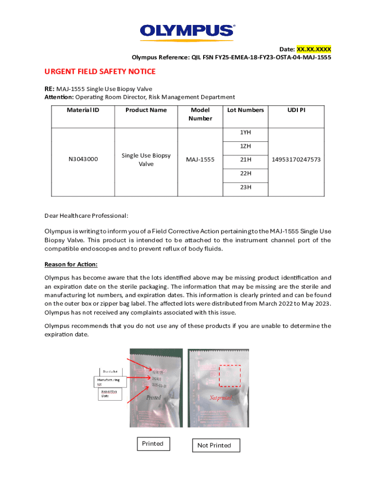 Date: XX.XX.XXXX Olympus Reference: QIL FSN FY25EMEA18FY23OSTA04MAJ1555URGENT FIELD SAFETY NOTICE RE: MAJ1555 Single Use Biopsy Valve Attention: Operating Room Director, Risk Management Department