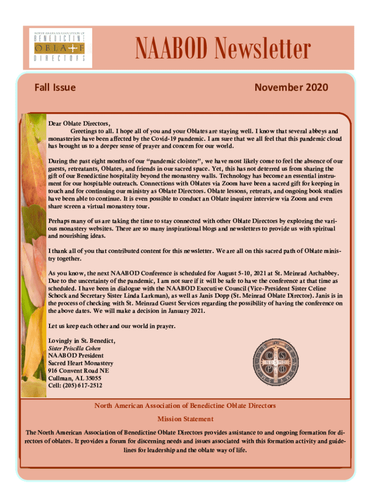 This newsletter addresses the impact of the Covid-19 pandemic on the Oblate community, highlights ongoing virtual engagements through technology, and discusses upcoming events such as the NAABOD Conference.