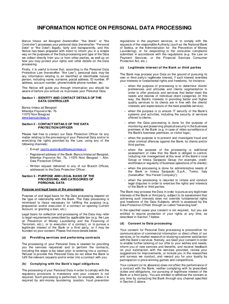INFORMATION NOTICE ON PERSONAL DATA PROCESSING Banca Intesa ad Beograd (hereinafter: the Bank or the Controller) processes your personal data (hereinafter: Personal Data or the Data) legally, fairly