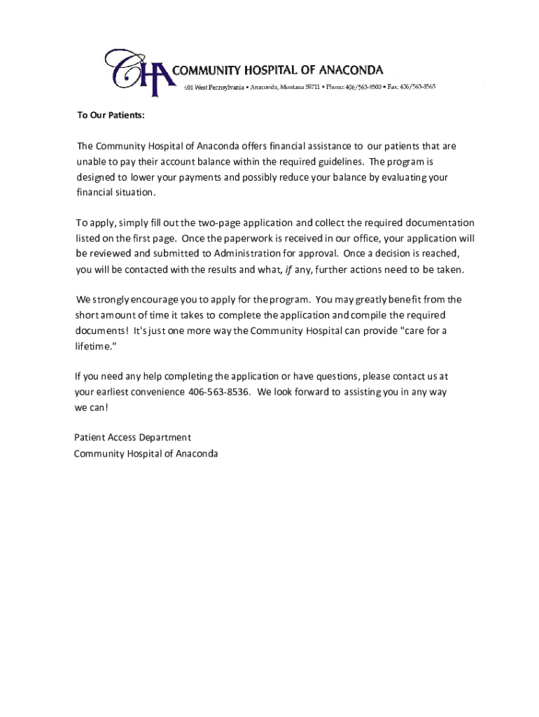 This application allows patients of the Community Hospital of Anaconda to apply for financial assistance if they are unable to pay their account balance. The program evaluates the patient\'s financial