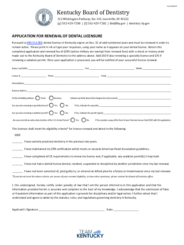 This document serves as the application for the renewal of dental licensure in Kentucky, detailing the necessary steps, fees, and eligibility criteria for maintaining an active dental license.