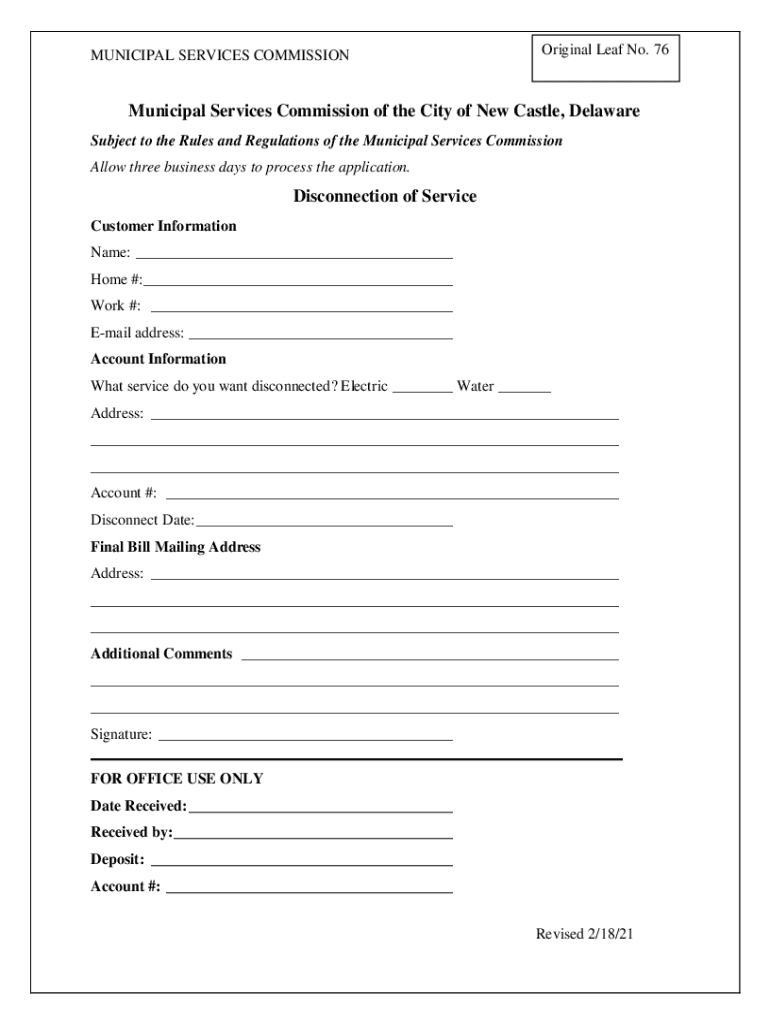 Application form for requesting the disconnection of municipal services such as electric and water by the Municipal Services Commission of the City of New Castle, Delaware.