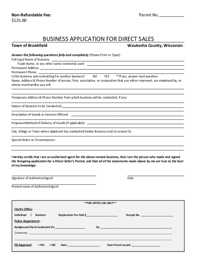 This document is an application for obtaining a Direct Seller’s Permit in the Town of Brookfield, Waukesha County, Wisconsin. It requires detailed information about the business, including legal