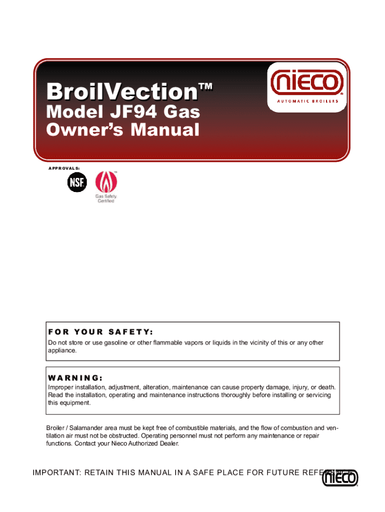 This manual provides safety, installation, and operating procedures for the Nieco Automatic Broiler / Salamander Model JF94. It includes important safety warnings, installation instructions, operational