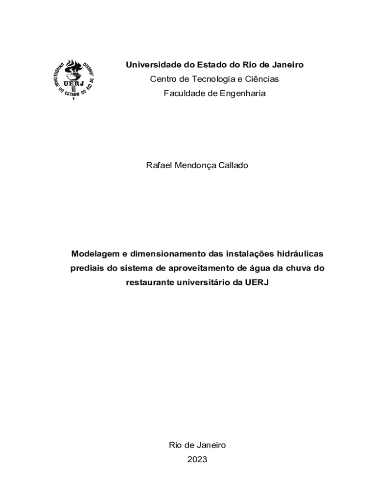 Este trabalho apresenta o projeto de um sistema de aproveitamento de água da chuva na UERJ, com análise da viabilidade técnica e econômica, dimensionamento das instalações hidráulicas, e uso